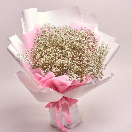 Букет из 11 персиковых мини-гербер и зелени в дизайнерской упаковке “Персиковые бабочки”