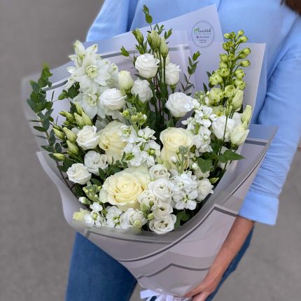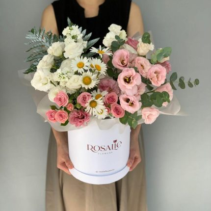 Бархатный цилиндр из голубых диантусов, розовых пионов и ароматной маттиолы