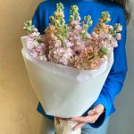 Маттиола – 9 шт.Тишью белое – 2 шт.Упаковка дизайнерская – 2 шт.Лента атласная – 2 шт.открытка с вашими пожеланиями – 1 шт.подкормка для срезанных цветов – 1 шт.
