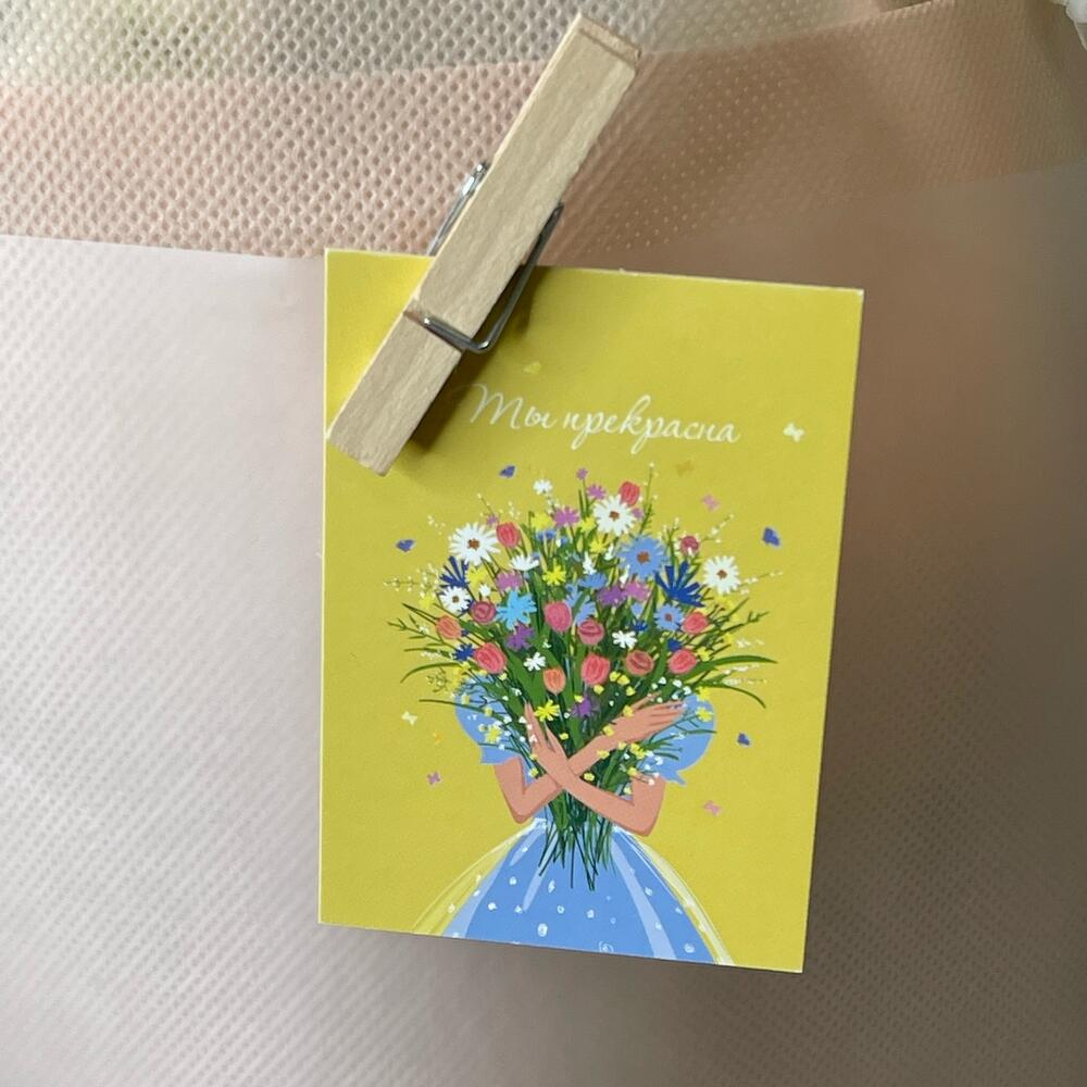 Лента – 2 шт.Маттиола – 9 шт.Упаковка дизайнерская – 1 шт.Открыточка с вашими пожеланиями – 1 шт.