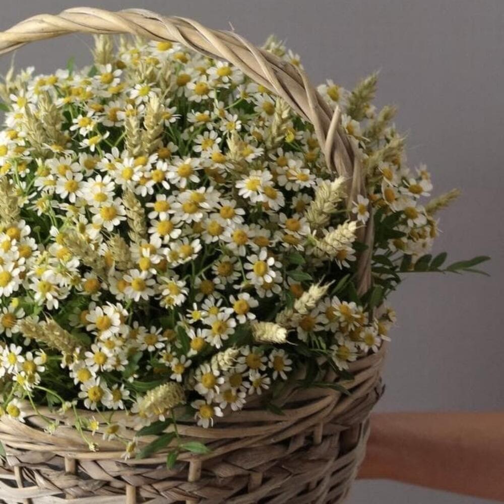 Матрикария – 29 шт.рожь пучок – 1 шт.Фисташка пучок – 1 шт.Оазис флористический – 2 шт.Корзина плетеная – 1 шт.