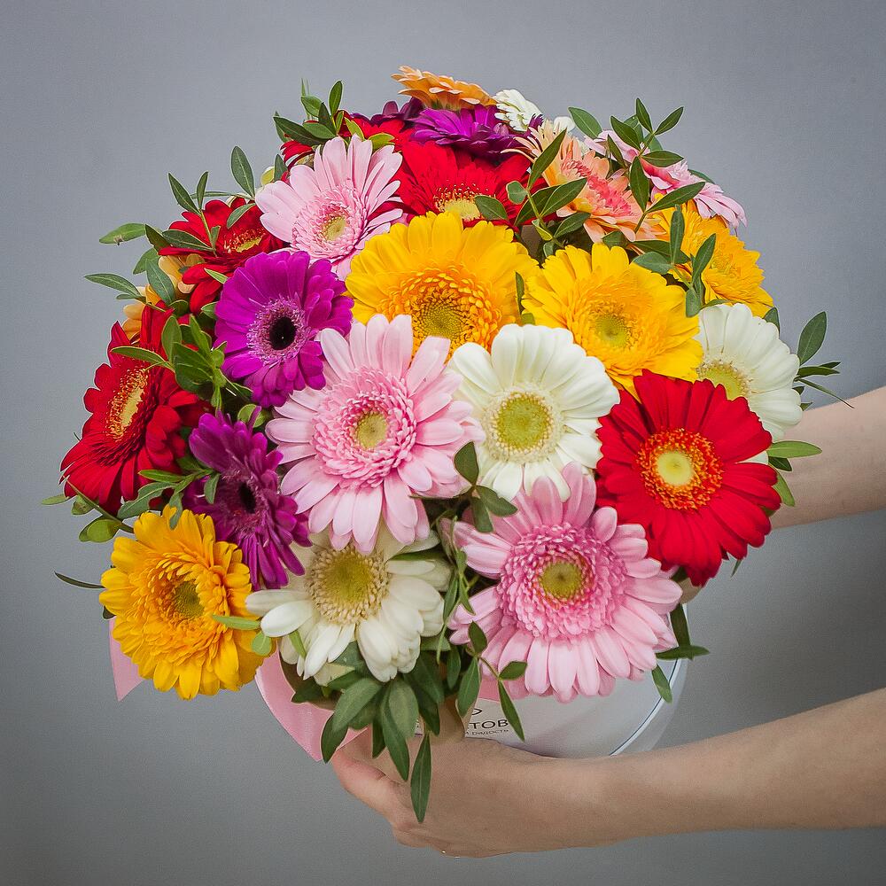 Букет из 25 гербер микс в шляпной коробке