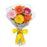 Салал – 1 шт.пленка цветная – 1 шт.лента атласная (желтый) – 1 шт.гербера (оранжевый) – 1 шт.гербера (желтый) – 1 шт.гербера (розовый) – 2 шт.гербера (малиновый) – 1 шт.
