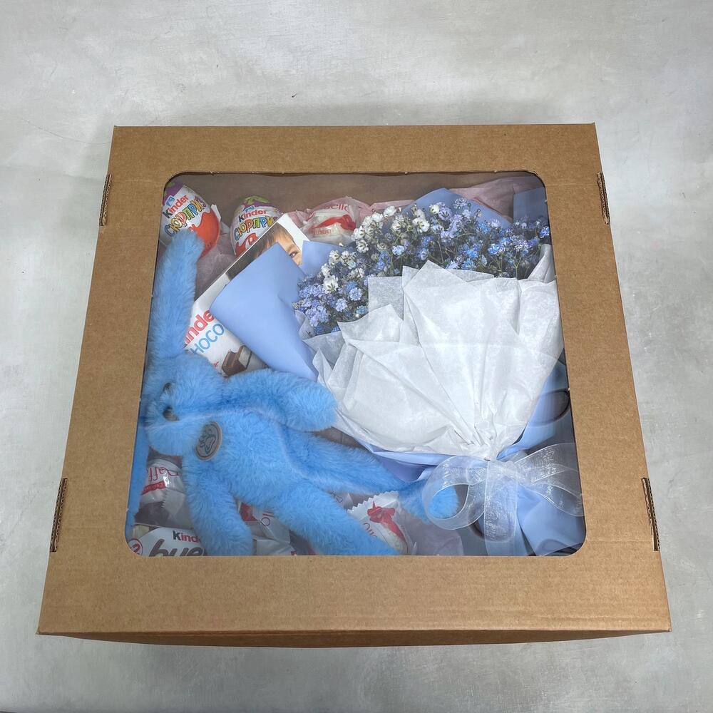 Гипсофила – 3 шт.Упаковка – 1 шт.Kinder bueno – 1 шт.Kinder сюрприз – 2 шт.Kinder chocolate – 1 шт.Raffaello конфеты – 10 шт.коробка крафт с окошком – 1 шт.игрушка зайчонок lapkin – 1 шт.