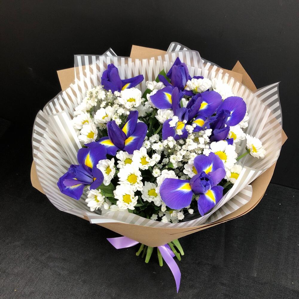 Сантини – 5 шт.Ирис – 7 шт.Гипсофила – 1 шт.Рускус – 5 шт.Крафт – 1 шт.
