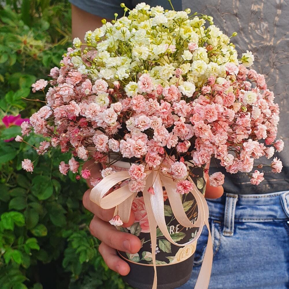 “Сиреневый туман” – композиция из гипсофилы в шляпной коробке