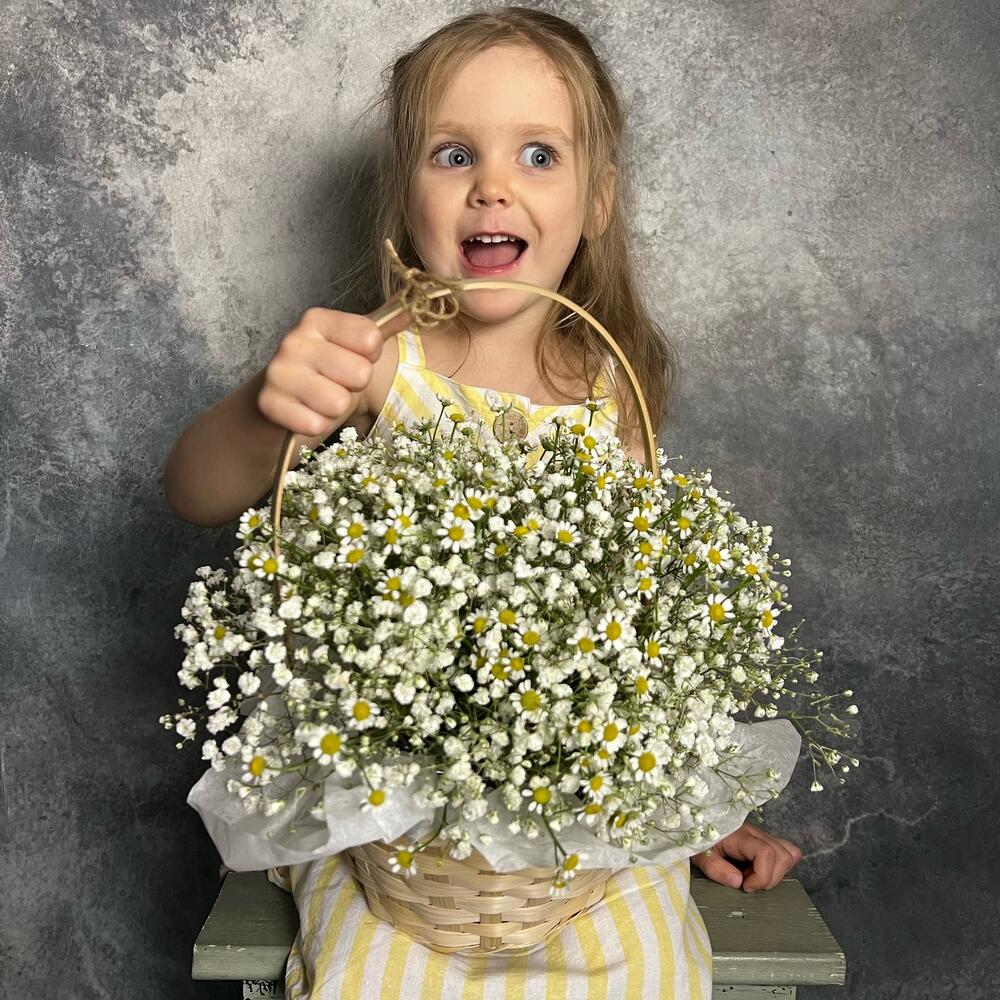 Матрикария – 6 шт.Гипсофила – 5 шт.Тишью белое – 1 шт.Оазис флористический – 1 шт.Корзина плетеная – 1 шт.