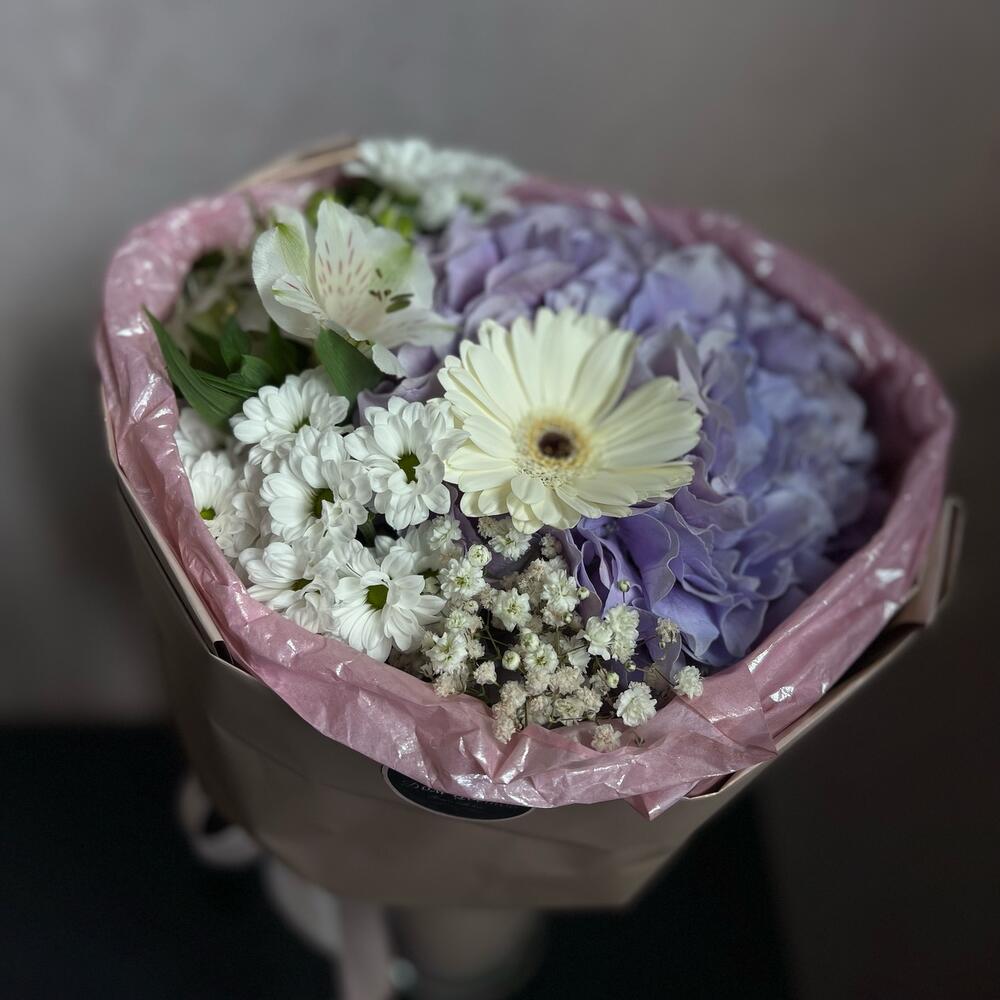 Альстромерия – 1 шт.Сантини – 1 шт.Гипсофила – 1 шт.Гербера – 1 шт.Гортензия – 1 шт.декоративная упаковка – 1 шт.Атласная лента – 1 шт.