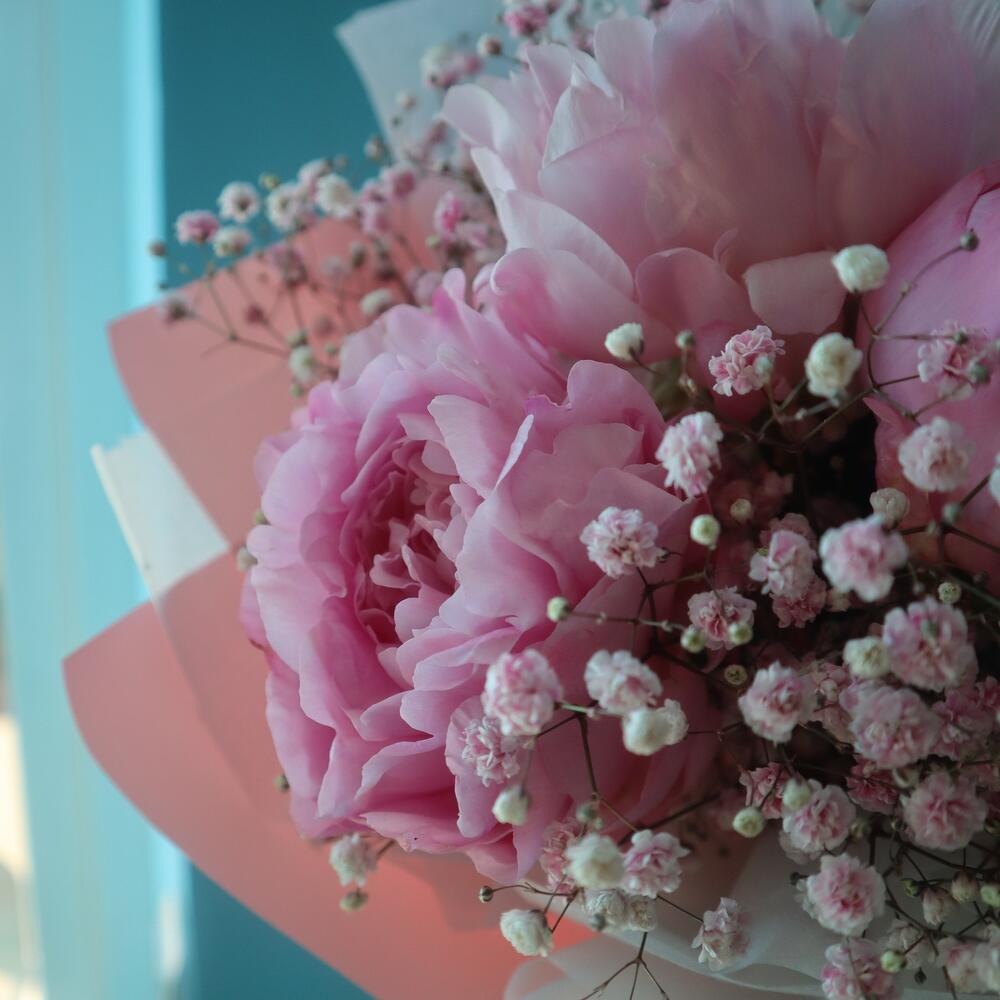 Букет из 11 коралловых пионов и декоративной зелени в дизайнерской упаковке "Корал Сенсейшен"