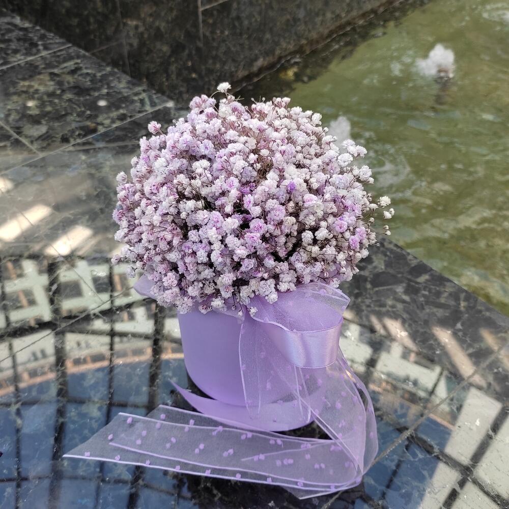 “Сиреневый туман” – композиция из гипсофилы в шляпной коробке