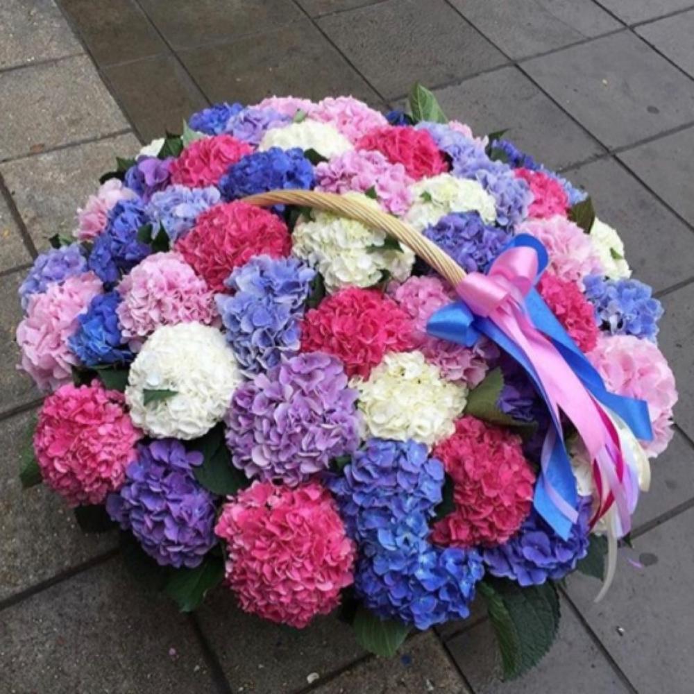Авторская композиция из гортензий, роз и ранункулюсов в шляпной коробке
