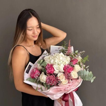 “Эвкалиптическая роскошь” гортензия и пионовидная кустовая роза