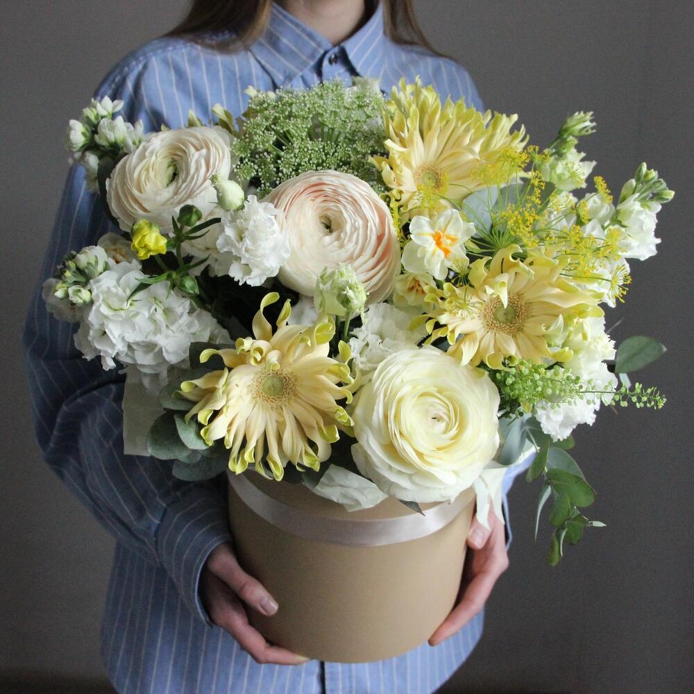 гербера кучерявая – 5 шт.Ранункулюс – 5 шт.Амми – 3 шт.Маттиола – 3 шт.Нарцисс – 2 шт.Лизиантус – 3 шт.Гвоздика – 6 шт.Гринбелл – 2 шт.Эвкалипт – 5 шт.Фисташка – 2 шт.Оазис флористический – 1 шт.Коробка шляпная – 1 шт.