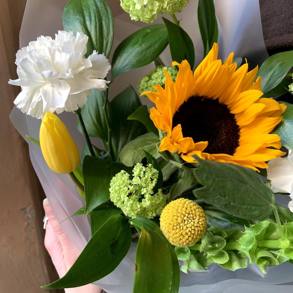 Вибурнум – 1 шт.Краспедия – 1 шт.Паникум – 1 шт.Подсолнух – 1 шт.Гвоздика белая – 2 шт.Тюльпан желтый – 1 шт.Рускус сочи – 5 шт.Молюцелла – 1 шт.Авторская упаковка – 1 шт.