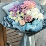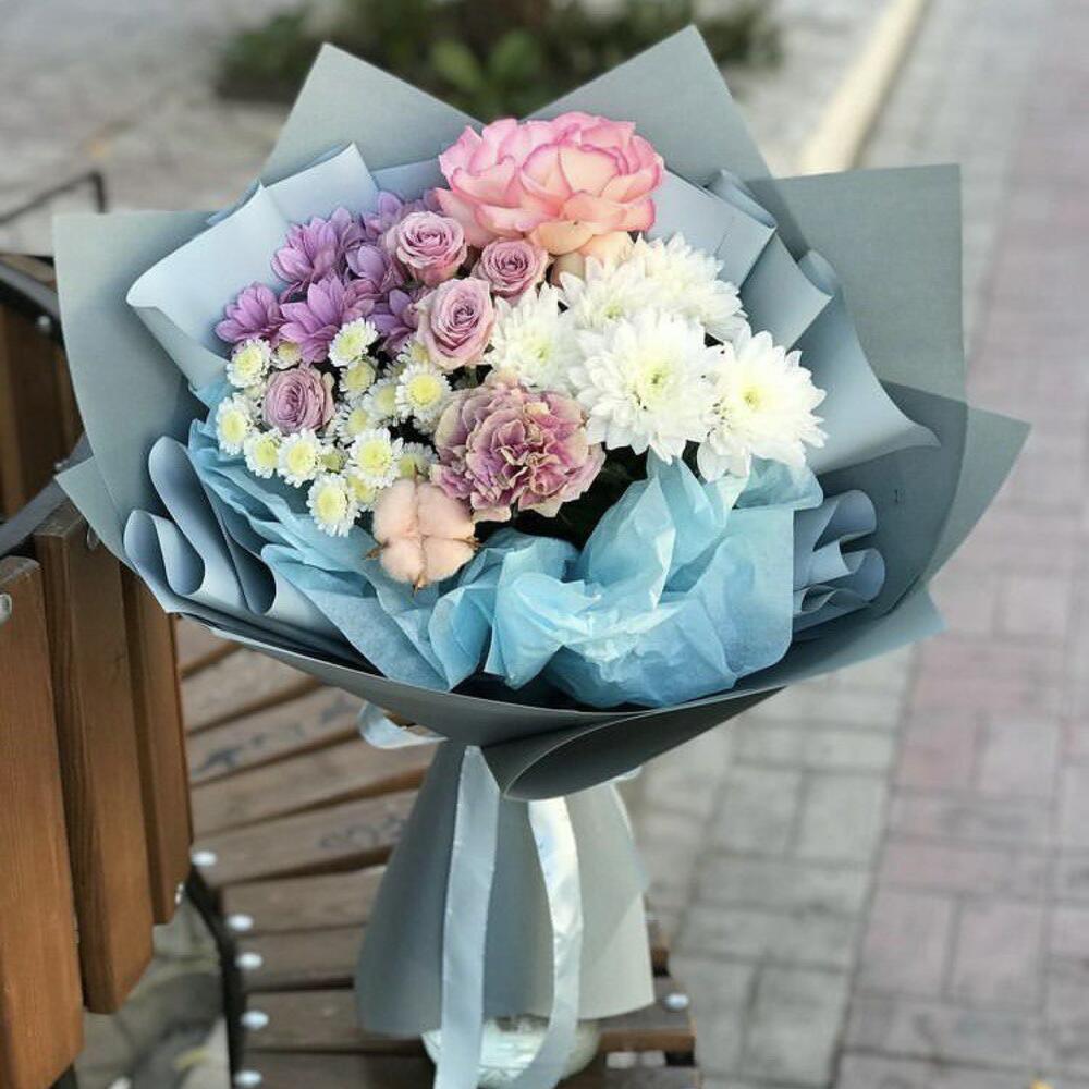 Букет из хризантемы и пионовидной розы «Марсель»(Роза кустовая пионовидная кения, хризантема Антонов, альстромерия)