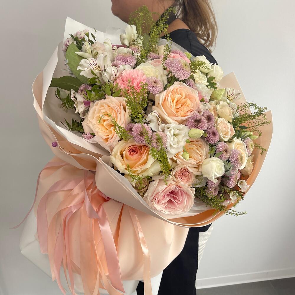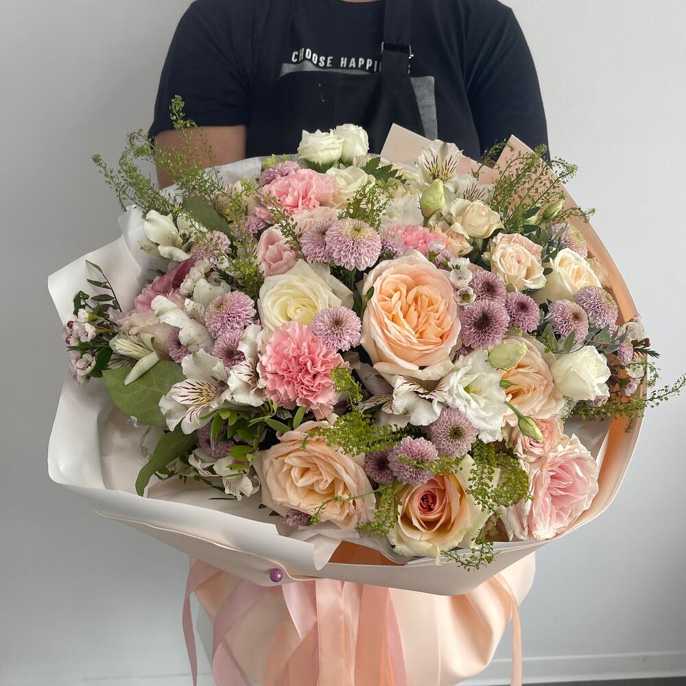 роза охара пионовидная – 11 шт.Кустовая роза – 11 шт.Сантинии – 11 шт.эустома белая – 3 шт.Гвоздика сортовая – 11 шт.Альстромерия – 11 шт.Зелень – 10 шт.Тишью белое – 2 шт.Фоамиран – 2 шт.Лента – 2 шт.