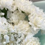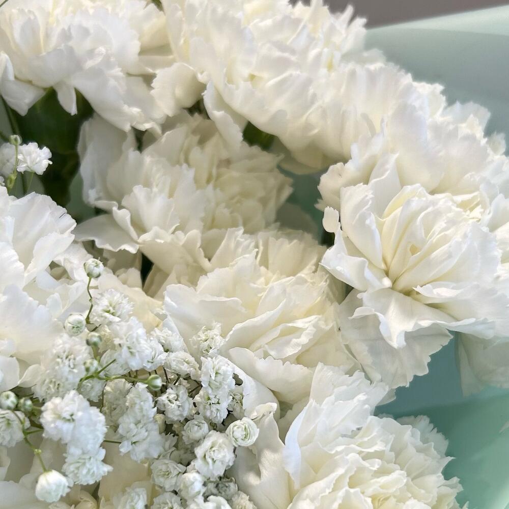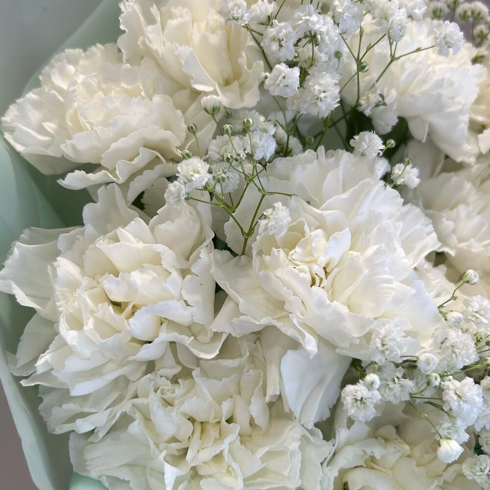 Букет из белых стойких сортовых диантусов и белых гипсофил в упаковке