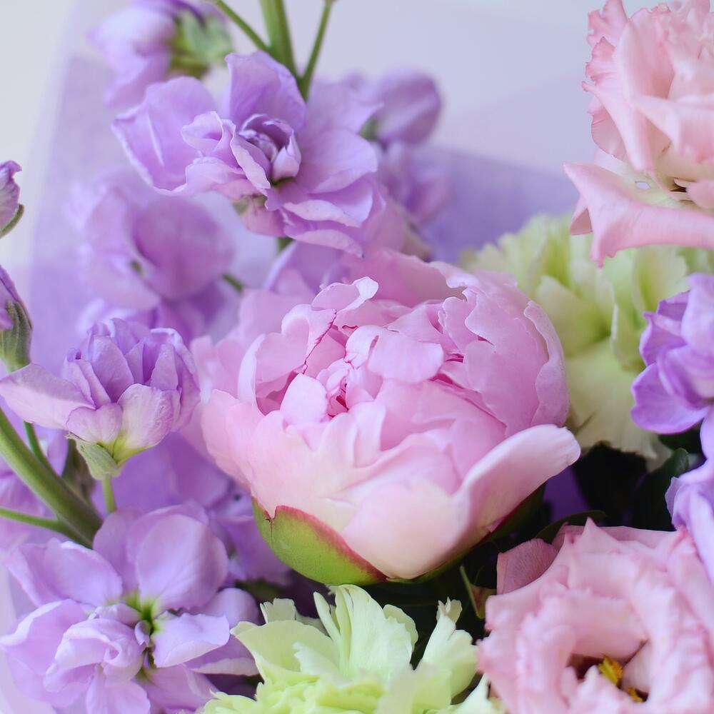 Маттиола – 3 шт.Пион – 1 шт.Эвкалипт – 1 шт.Упаковка дизайнерская – 1 шт.диантус сортовой микс – 3 шт.зелень техническая пучок – 1 шт.эустома alissa pink – 1 шт.динтус кустовой – 1 шт.