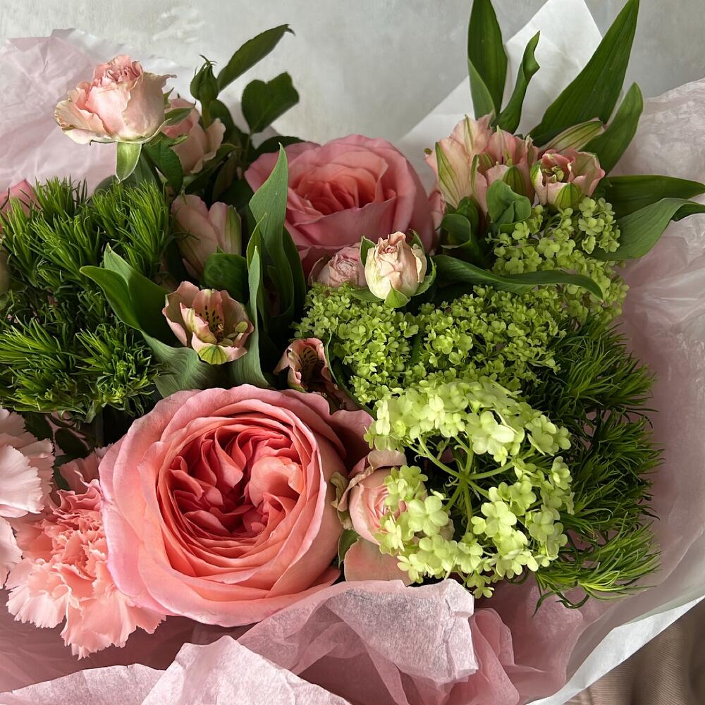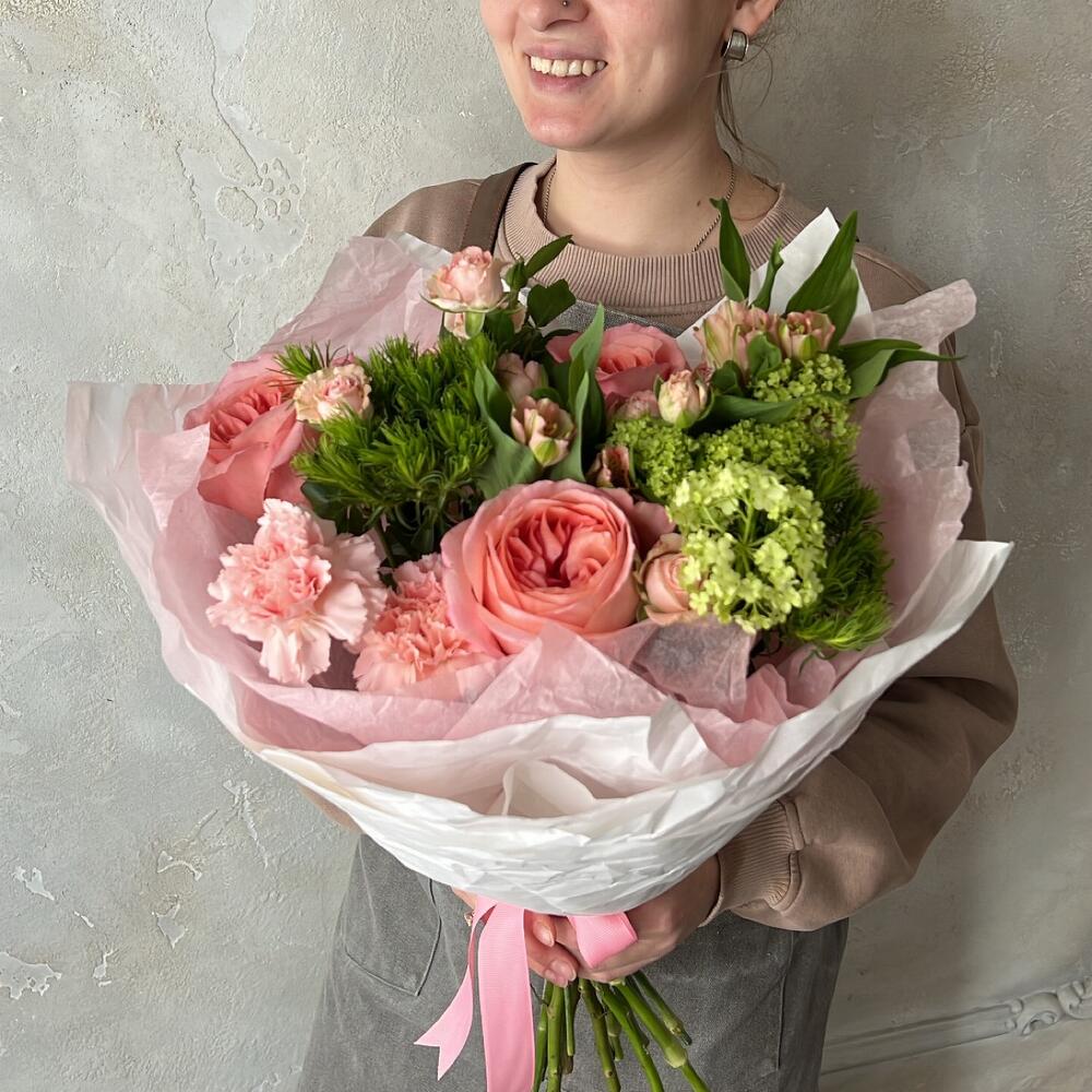 Дизайнерский букет с пионовидной розой, вибурнумом, альстромерией и гвоздикой