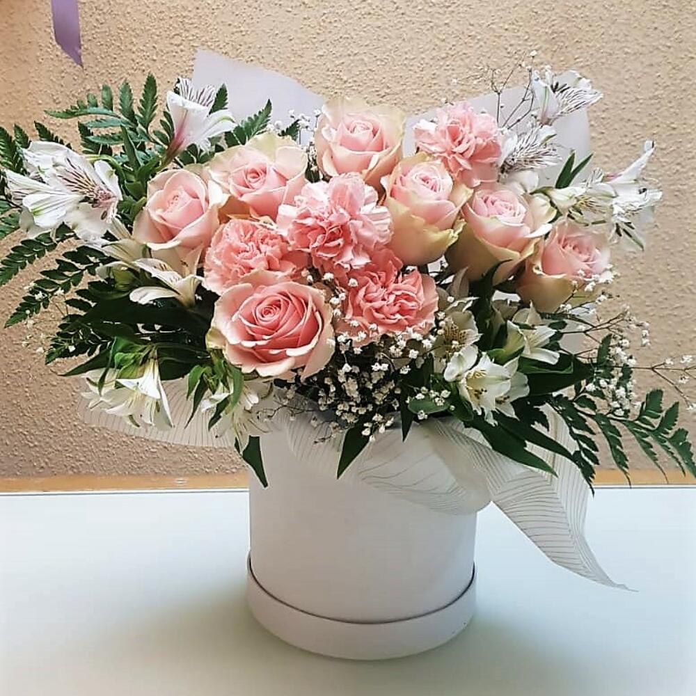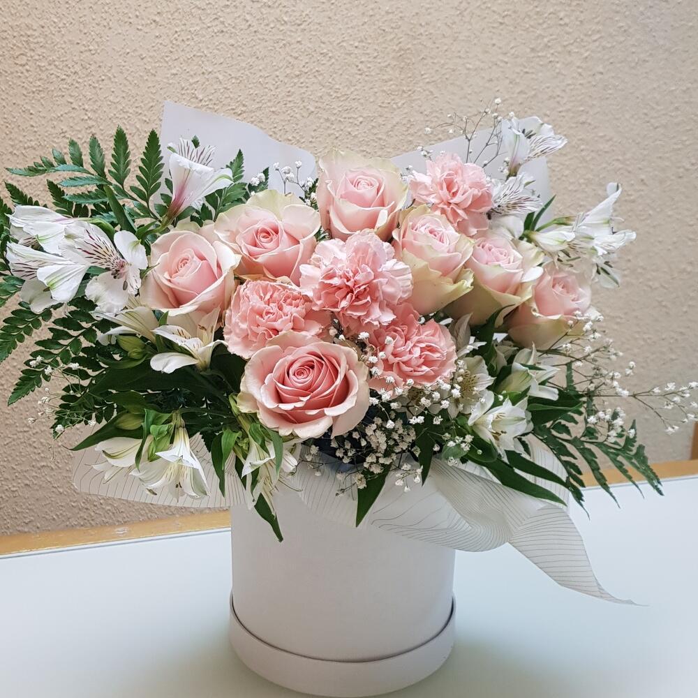 Роза Эквадор – 7 шт.Альстромерия – 4 шт.Гвоздика – 4 шт.Коробка шляпная – 1 шт.бумага дизайнерская – 1 шт.Листья папоротника – 3 шт.