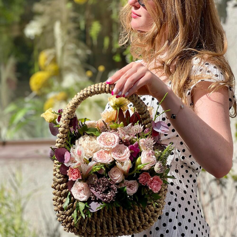 Роза кустовая пионовидная – 3 шт.Альстромерия – 2 шт.Роза – 3 шт.Лизиантус – 3 шт.Диантус – 7 шт.Астранция – 2 шт.Клематис – 1 шт.цветы микс – 5 шт.зелень декоративная – 5 шт.Эвкалипт – 1 шт.