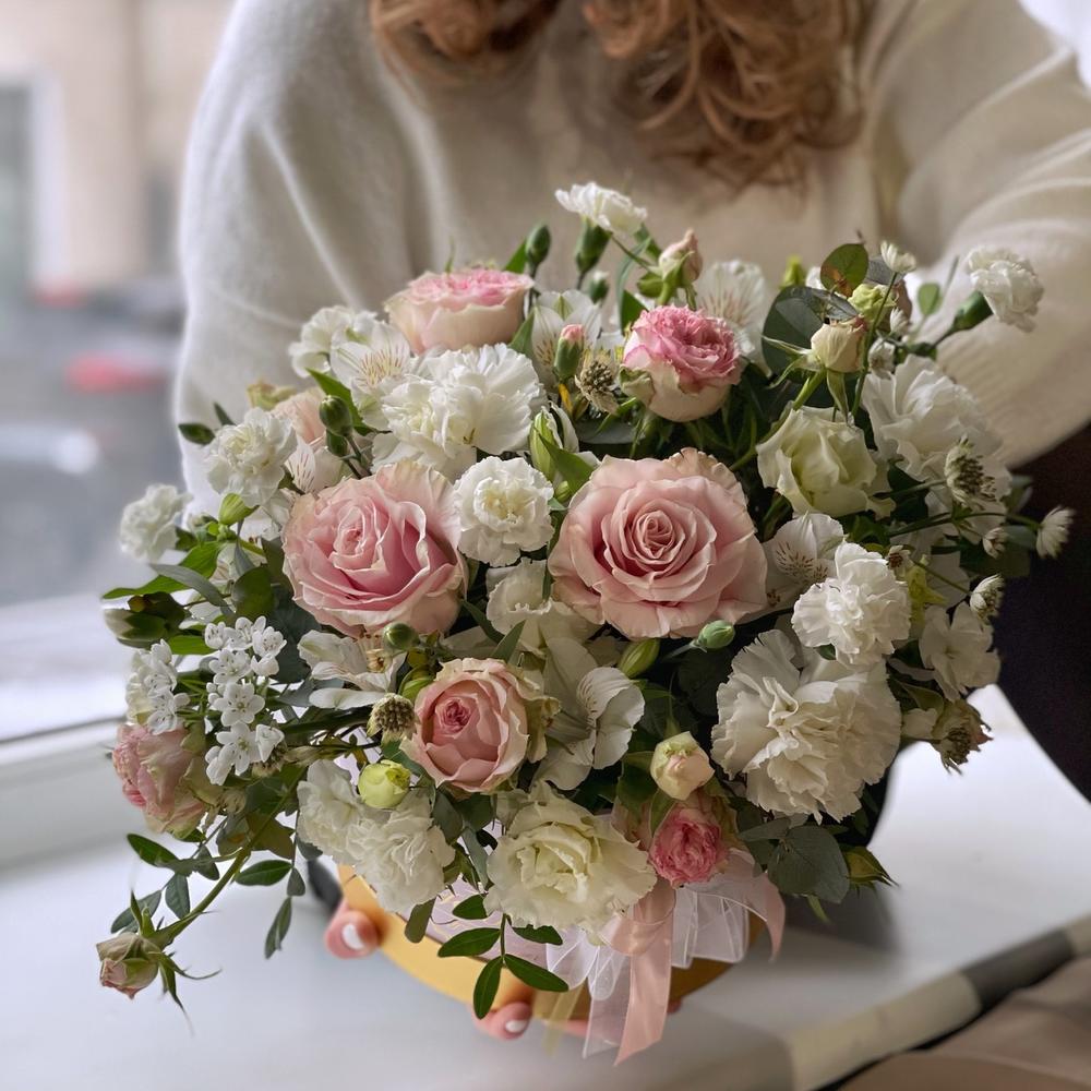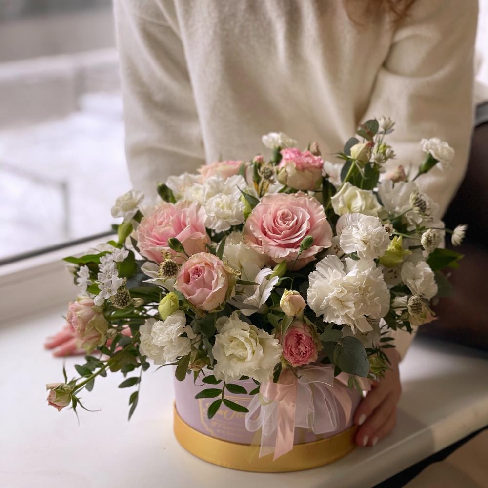 Роза – 3 шт.Роза кустовая – 2 шт.Лизиантус Алиса белый – 3 шт.Диантус сортовой – 4 шт.Альстромерия – 2 шт.Астранция – 2 шт.Эвкалипт – 2 шт.Фисташка – 2 шт.Коробка шляпная – 1 шт.Флористическая губка – 1 шт.Лента – 1 шт.