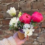 Лизиантус – 1 шт.Пион – 2 шт.Эвкалипт – 1 шт.Гвоздика – 1 шт.Губка флористическая – 1 шт.стакан крафт – 1 шт.