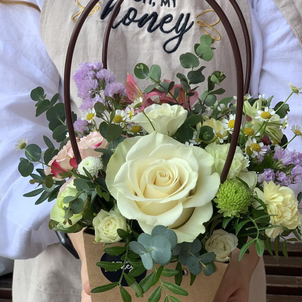 Роза – 1 шт.Роза кустовая – 1 шт.Гвоздика кустовая – 2 шт.Матрикария – 1 шт.Статица – 1 шт.Фисташка – 1 шт.Эвкалипт – 1 шт.Сумочка – 1 шт.Альстромерия – 1 шт.