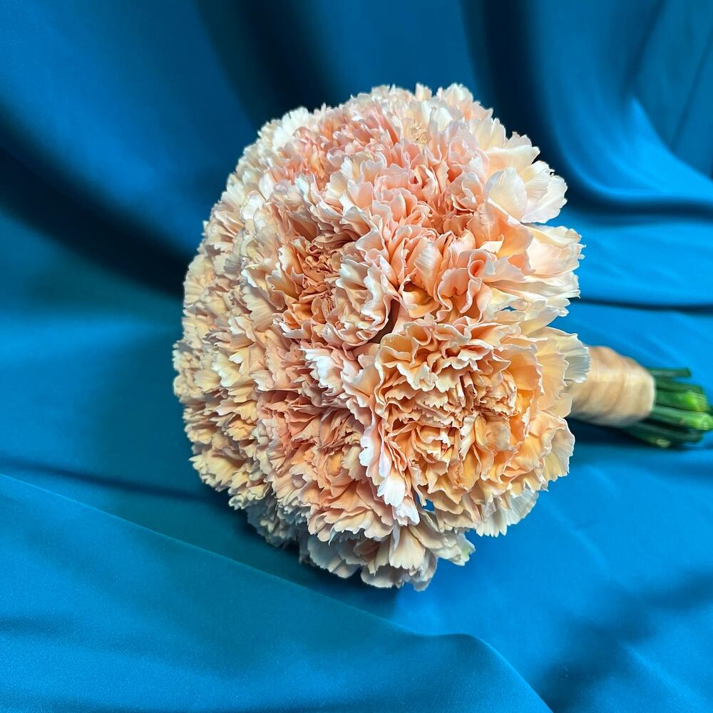 Свадебный букет имеет классическую круглую форму, выполнен в европейском стиле, что подразумевает минимализм. Диантус благодаря своим рюшечным лепесткам и оттенком придаёт букету особый шарм.