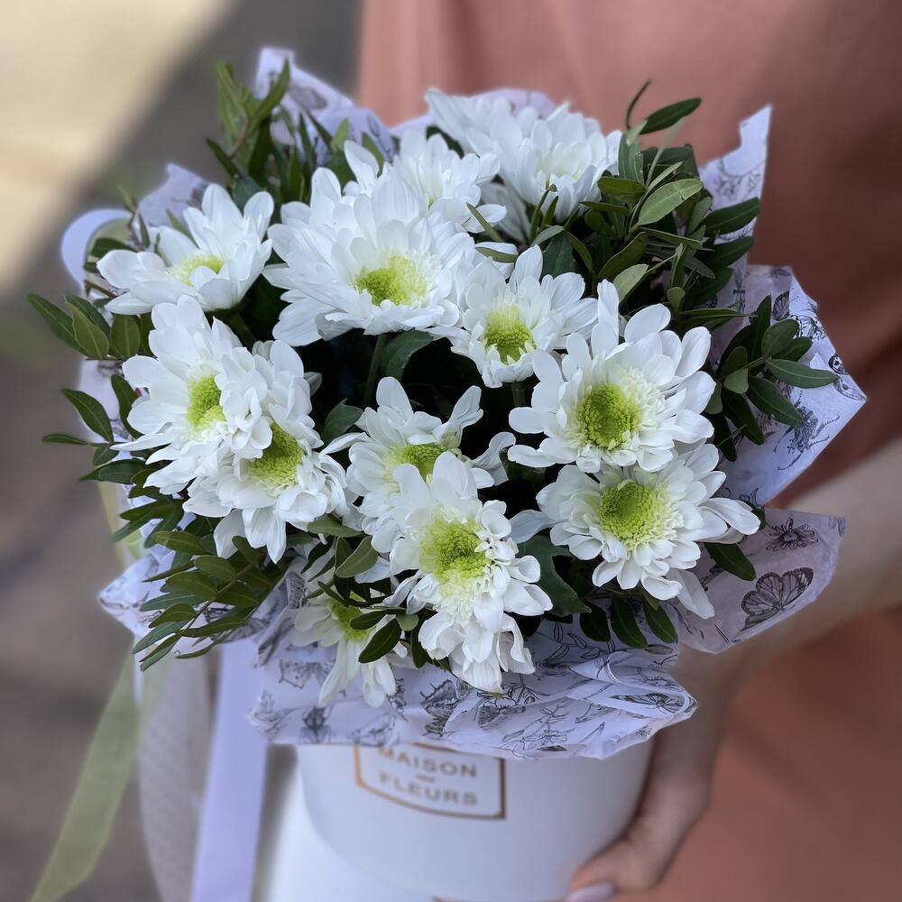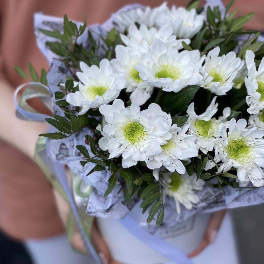 Хризантема кустовая – 3 шт.Фисташка – 2 шт.Тишью – 1 шт.коробка 12*12 – 1 шт.