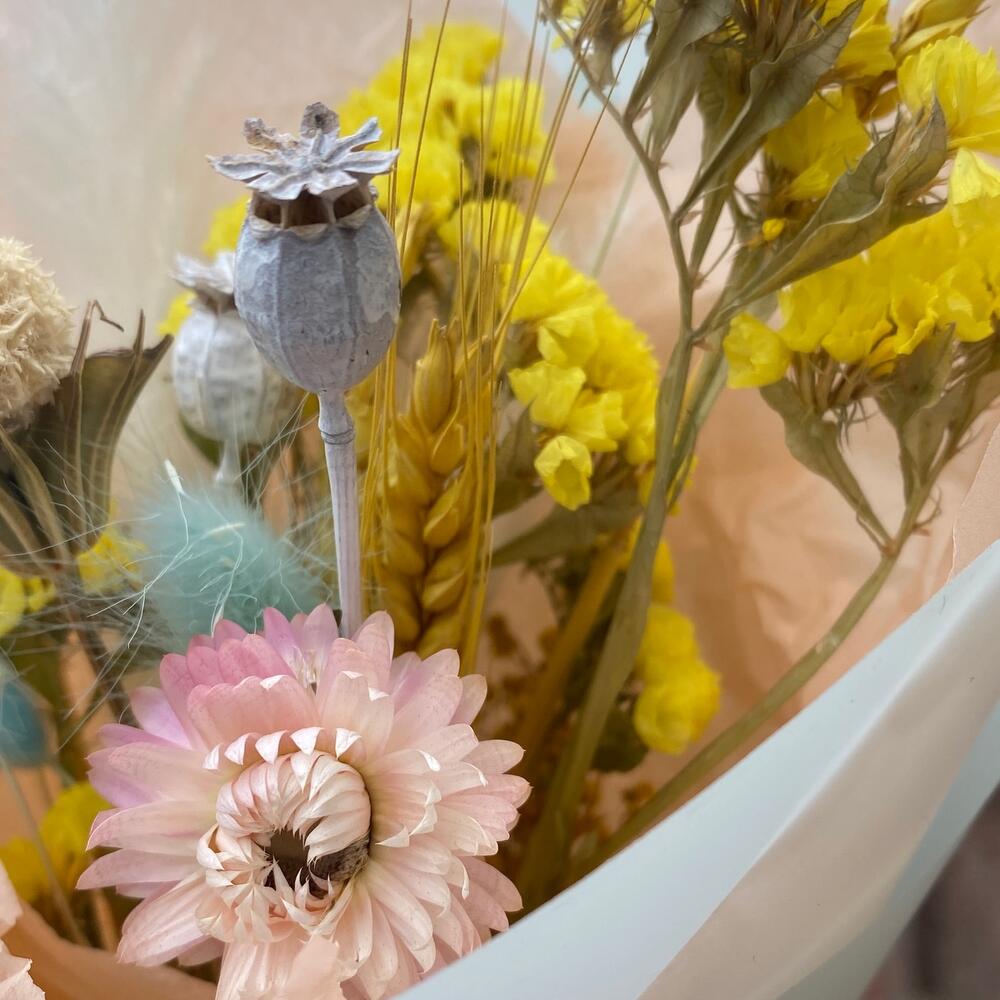 Скабиоза – 1 шт.Статица – 3 шт.Лагурус – 5 шт.Гелихризум – 1 шт.Пшеница (сухоцвет) – 2 шт.мак коробка – 2 шт.