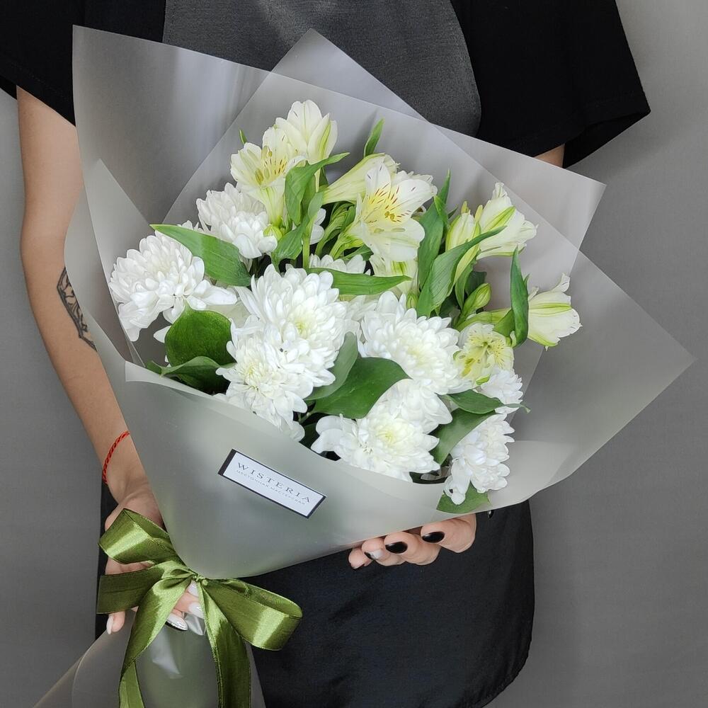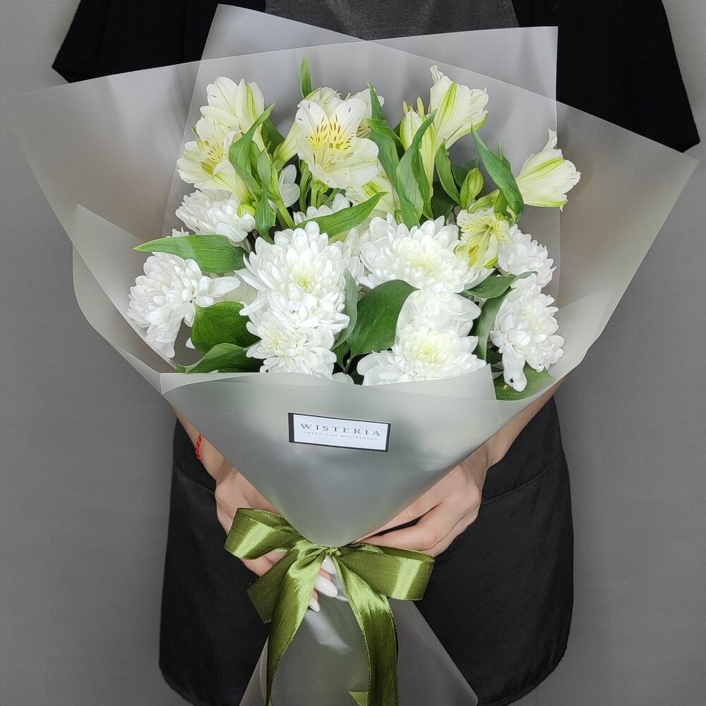 Альстромерия – 2 шт.Рускус – 3 шт.Хризантема кустовая – 2 шт.Лента атласная – 1 шт.Упаковка дизайнерская – 1 шт.