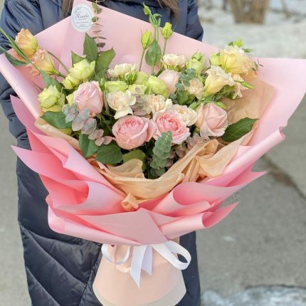 Альстромерии, Гвоздики, Кустовые розы, Лизиантусы, Розы, Хризантемы