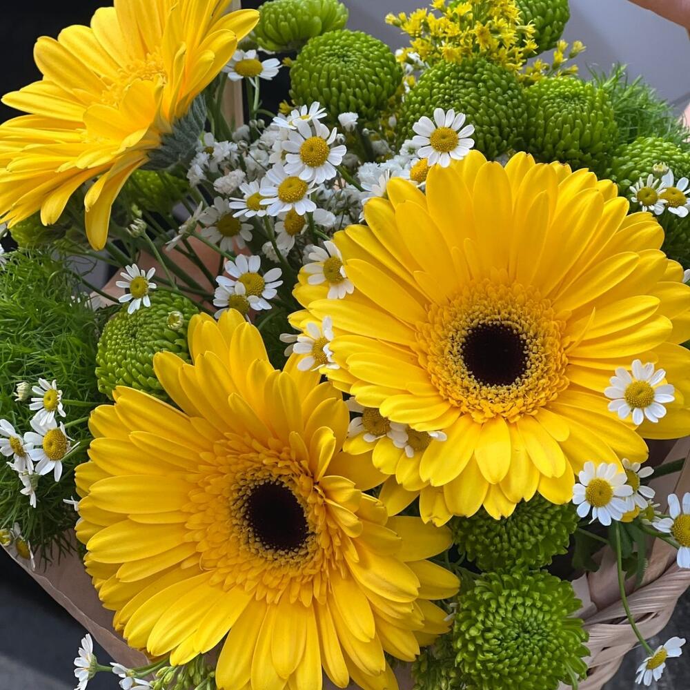 Солидаго – 2 шт.Гербера – 3 шт.Матрикария – 3 шт.Крафт – 1 шт.Хризантема зеленая – 4 шт.Корзина плетеная – 1 шт.Оазис флористический – 1 шт.