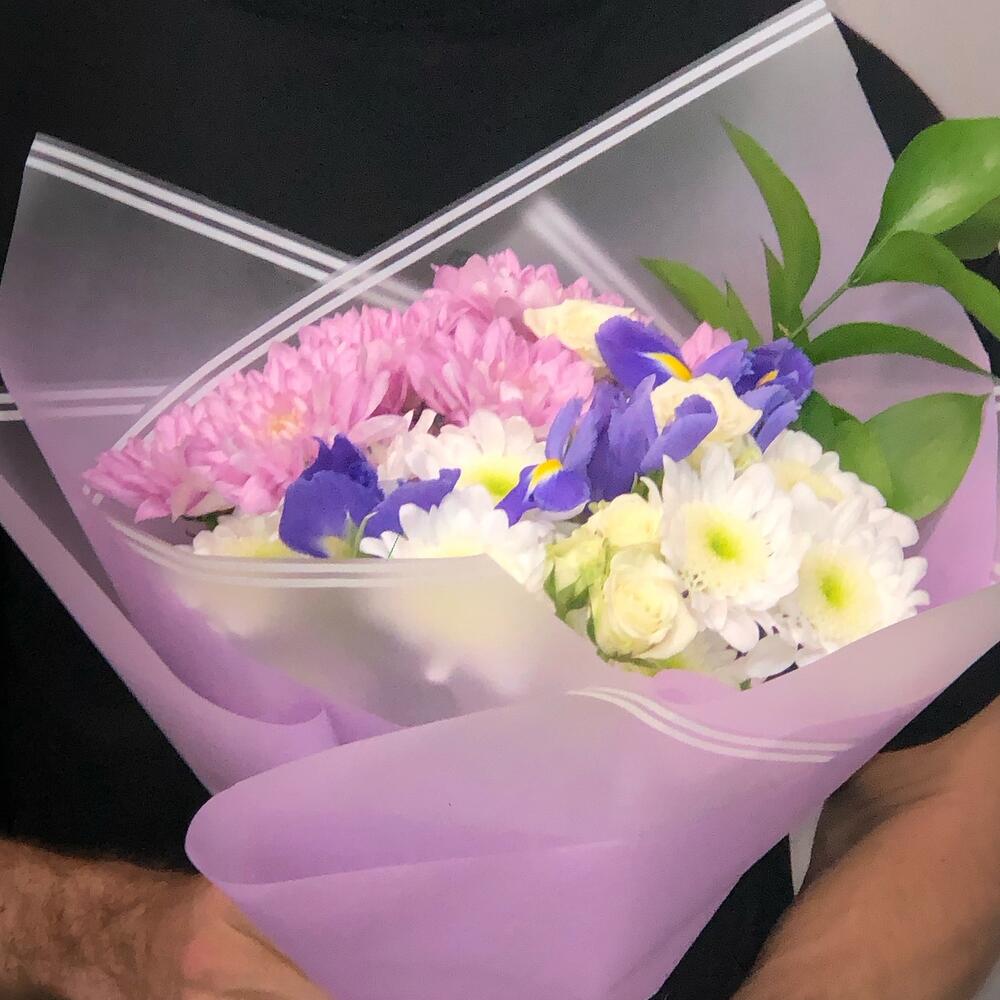 Ирис – 4 шт.микс хризантем – 3 шт.Лизиантус – 2 шт.листики – 3 шт.Упаковка – 1 шт.