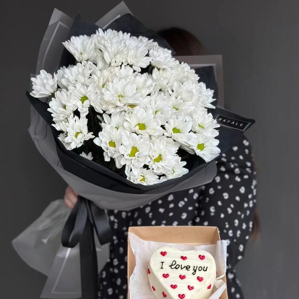 Чудесный сет из моно букета ромашковидных хризантем и бенто тортика.
