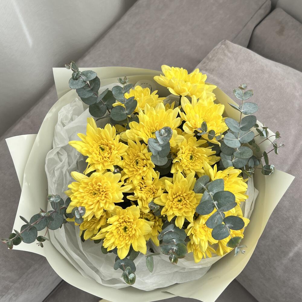 Хризантема кустовая – 3 шт.Упаковка – 1 шт.эвкалипт цинерея пучок – 1 шт.тишью белая хрустящая – 1 шт.
