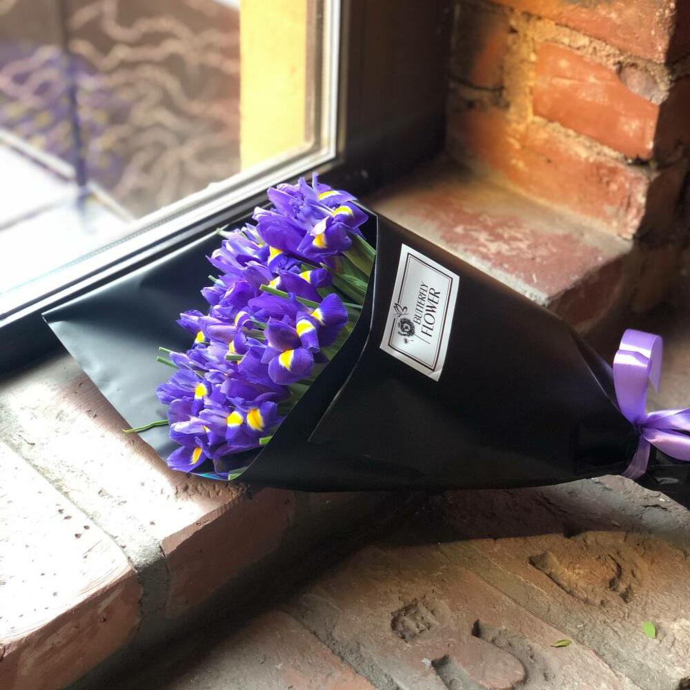 Красивый, яркий букет из 19 ирисов в крафте "Армантьер"