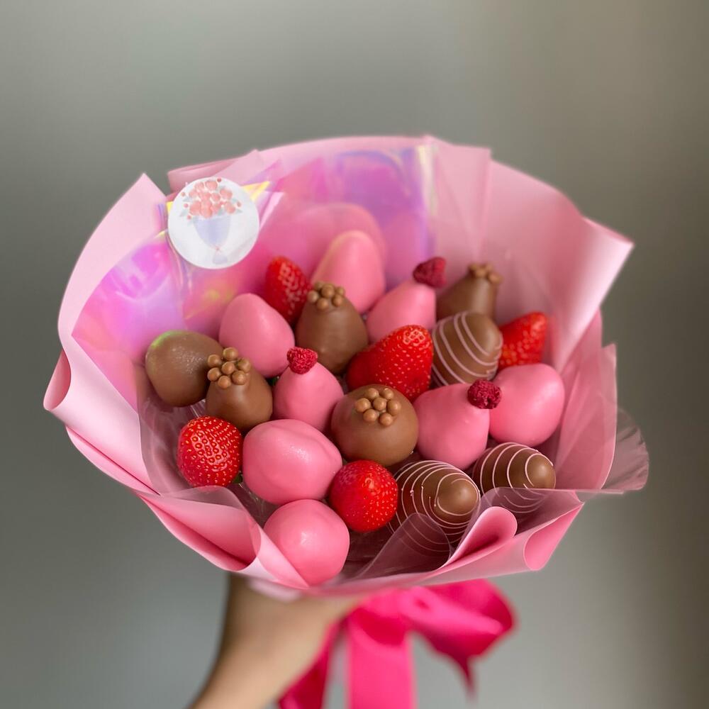 Клубника – 300 гр.шоколадные шарики – 4 шт.сублимированная малина – 3 шт.шоколад каллебаут – 100 гр.