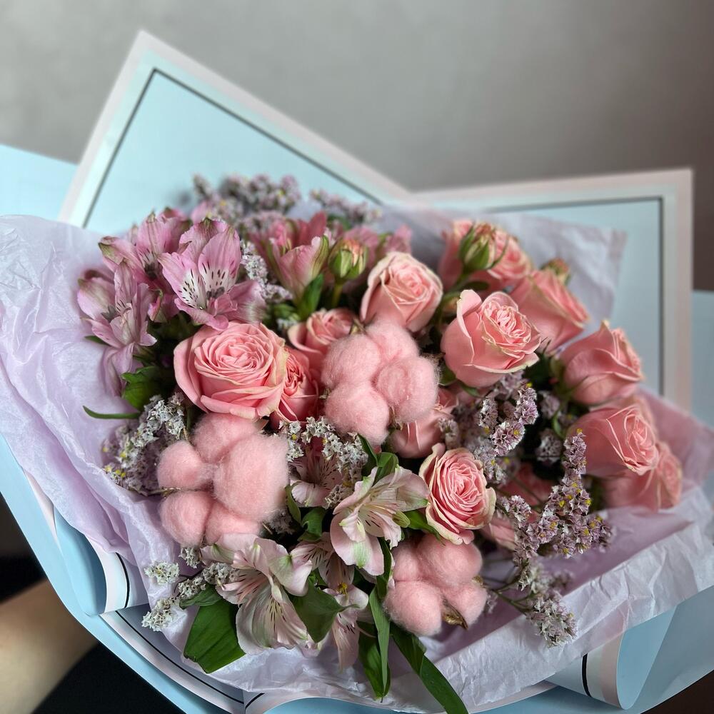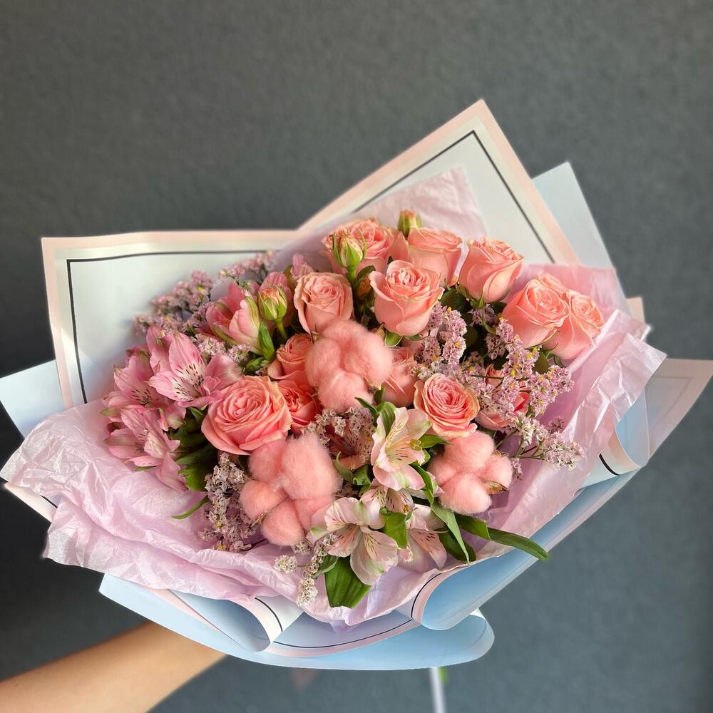 Кустовая роза – 3 шт.Альстромерия – 3 шт.Лимониум – 2 шт.Хлопок (сухоцвет) – 3 шт.декоративная упаковка – 1 шт.Атласная лента – 1 шт.