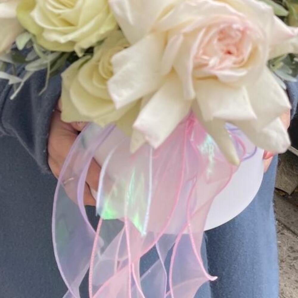 Альстромерия – 1 шт.Озотамнус – 1 шт.Сантини белая – 2 шт.Хлопок – 5 шт.Эустома – 1 шт.Коробка шляпная – 1 шт.Роза белая – 7 шт.Оазис флористический – 1 шт.Охара – 5 шт.фисташка зелень – 3 шт.