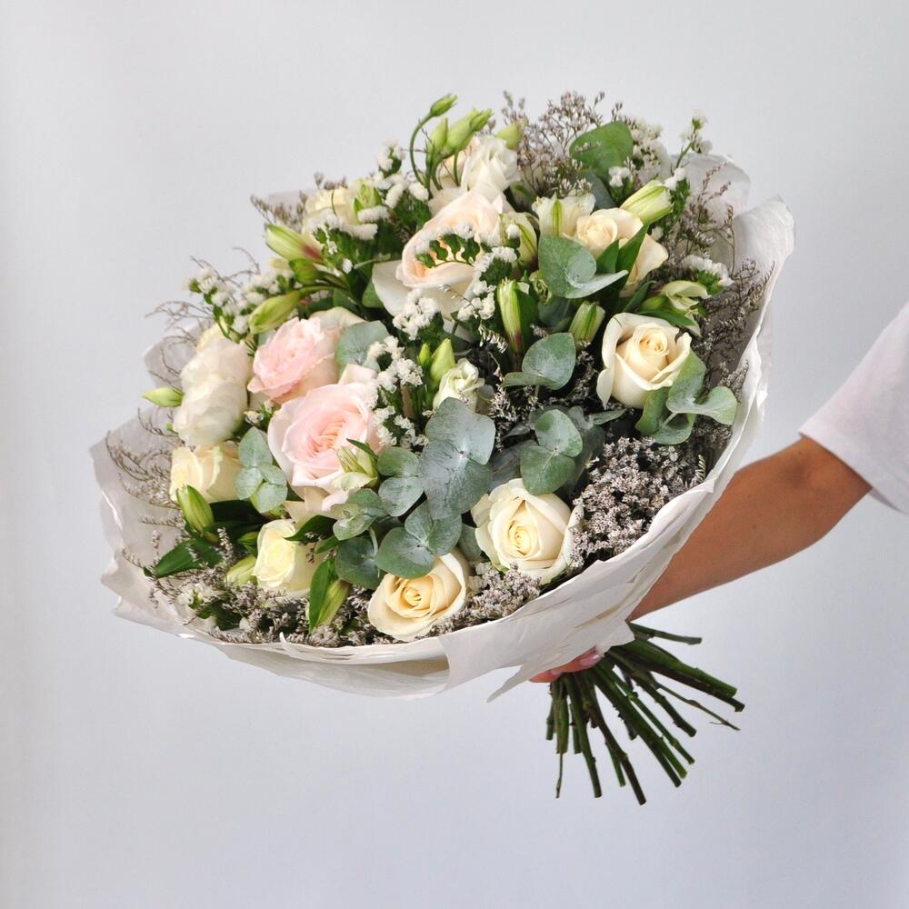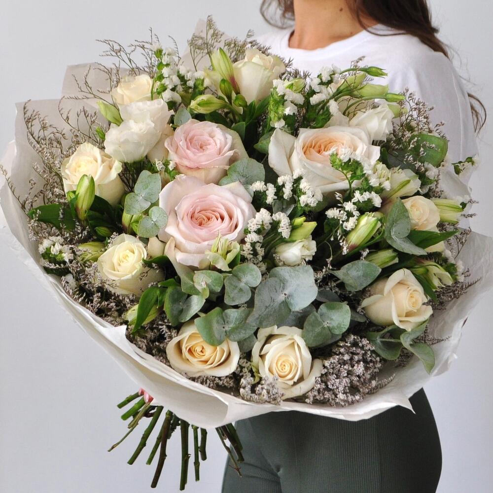 Альстромерия – 5 шт.Лимониум – 2 шт.Статица – 2 шт.Эвкалипт – 2 шт.Роза Эквадор – 8 шт.Эустома – 3 шт.Лента атласная – 1 шт.Роза пионовидная – 3 шт.Упаковка дизайнерская – 6 шт.
