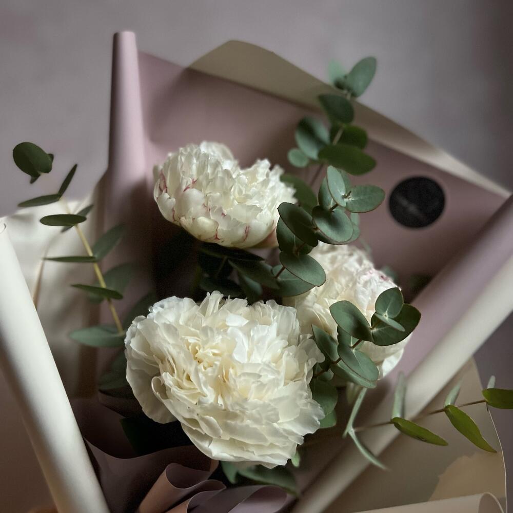 Эвкалипт – 6 шт.Атласная лента – 1 шт.декоративная упаковка – 1 шт.пионы – 3 шт.