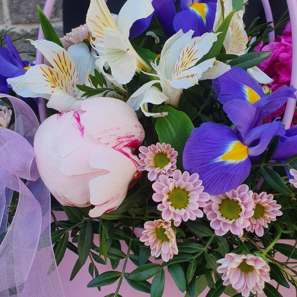 Пион – 1 шт.Фисташка – 3 шт.Лента атласная – 1 шт.Пленка матовая – 1 шт.Сумочка картонная – 1 шт.Сантини – 2 шт.Альстромерия – 2 шт.Ирис – 3 шт.Маттиола – 1 шт.