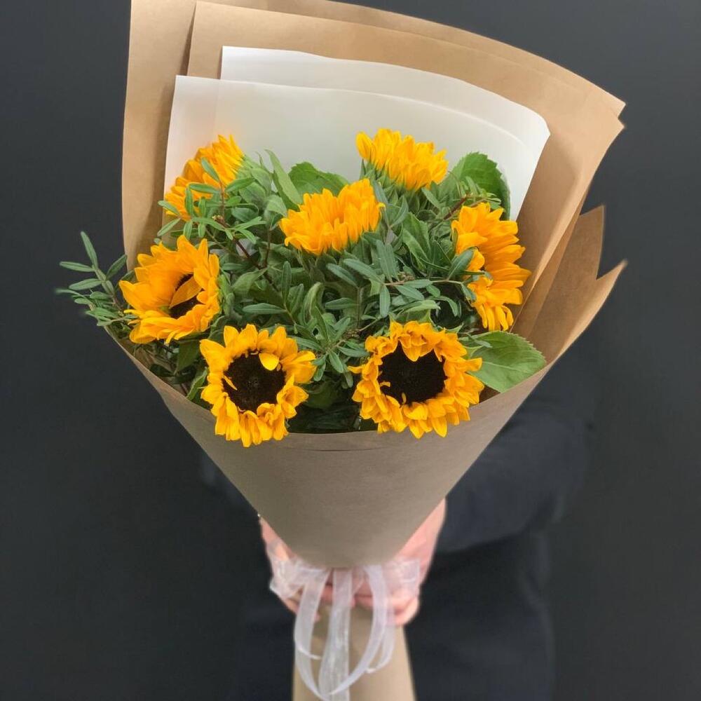 Подсолнух – 7 шт.Фисташка – 3 шт.Упаковка дизайнерская – 2 шт.Лента атласная – 1 шт.