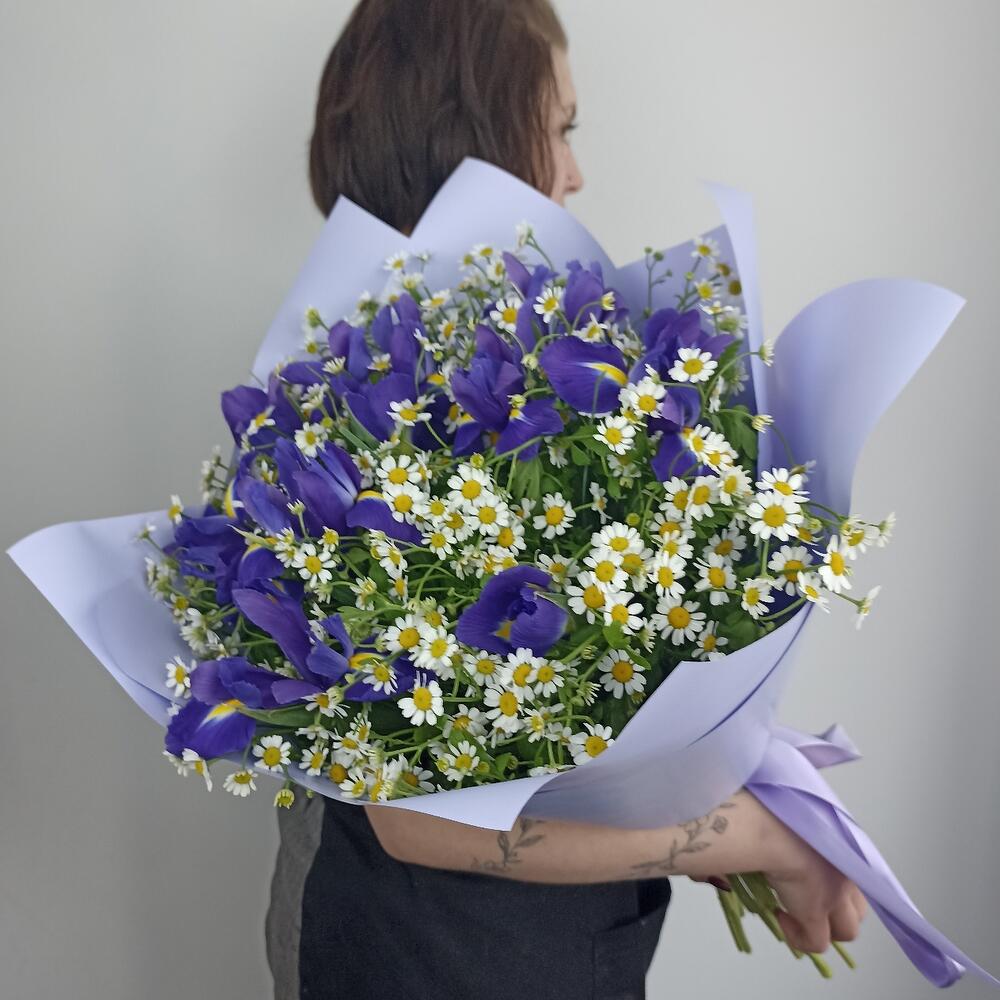 Матрикария (ромашка) – 19 шт.Ирис Blue Magic – 10 шт.Пленка матовая – 2 шт.Лента – 1 шт.