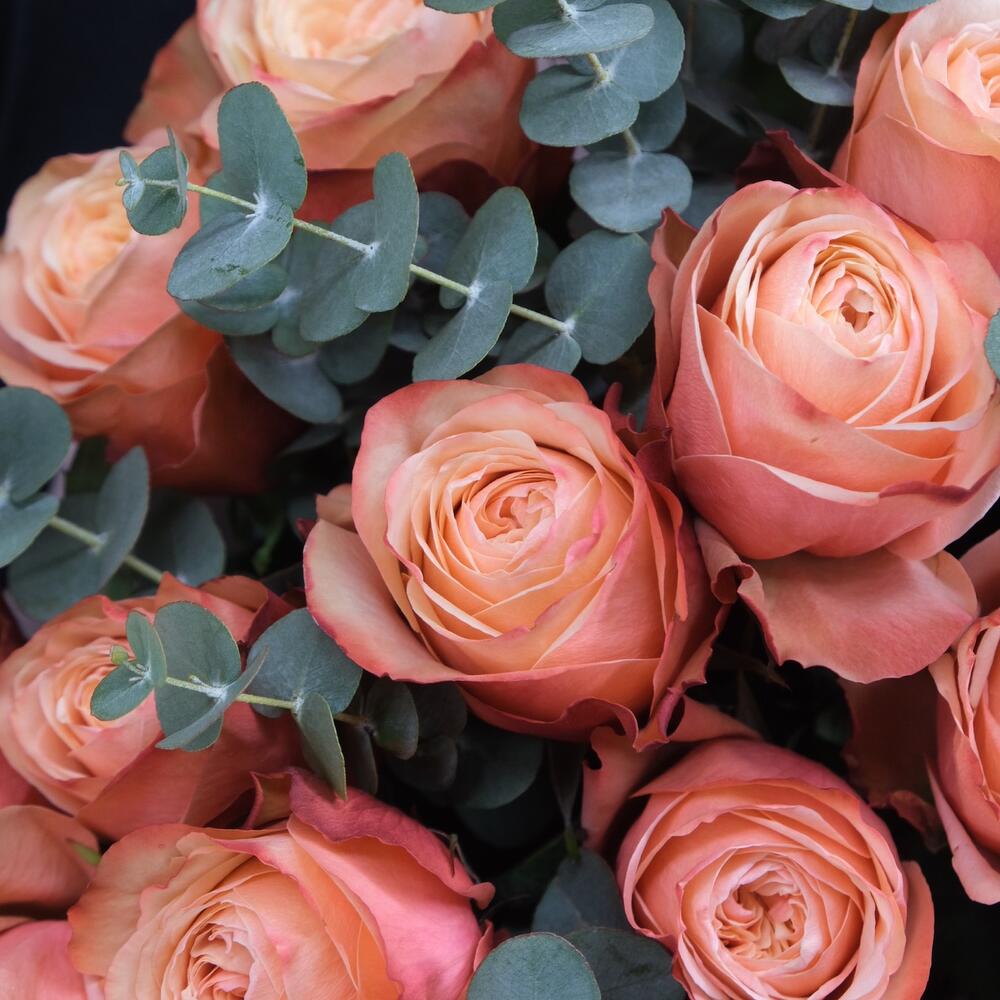 Эвкалипт – 3 шт.Роза пионовидная – 15 шт.Упаковка дизайнерская – 1 шт.Лента атласная – 1 шт.