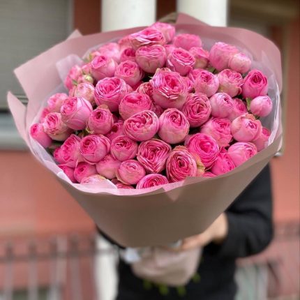 Букет из 25 веток кустовых пионовидных роз ,в дизайнерском оформлении. Количество розочек (бутонов ) в букете может достигать 151 штуки