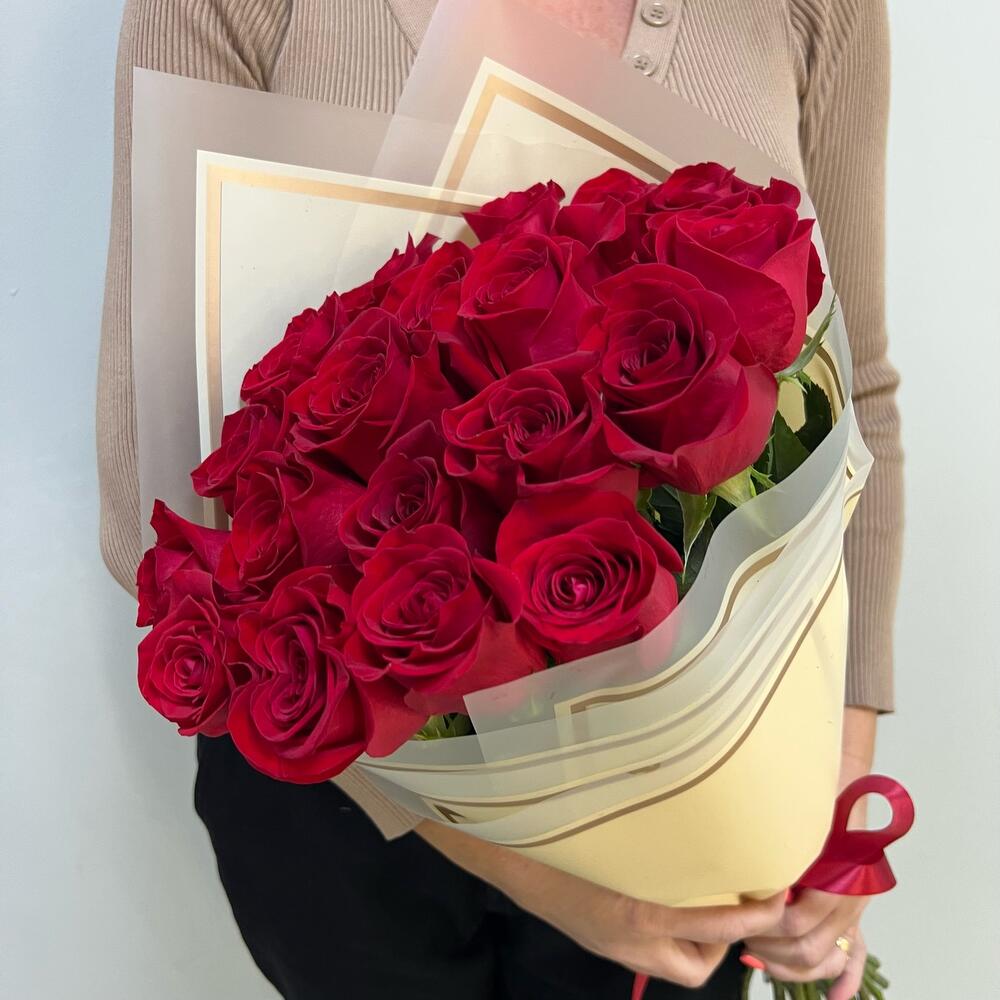 роза эквадор 60 см премиум – 21 шт.Лента атласная красная – 1 шт.Пленка дизайнерская – 2 шт.Роза Эквадор 60 см – 21 шт.