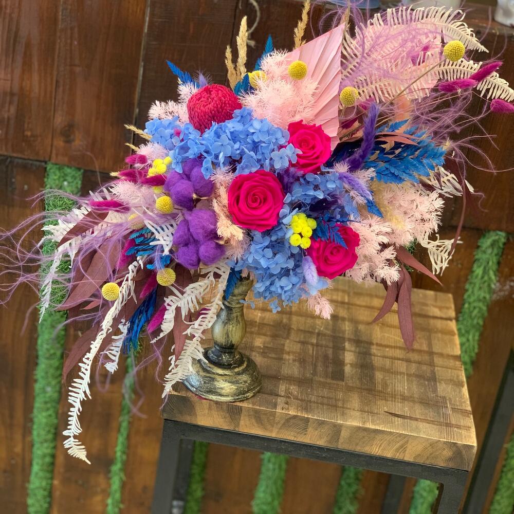 Сухоцветы – 230 шт.Роза стабилизированная – 5 шт.Банксия – 1 шт.умбрелла – 3 шт.